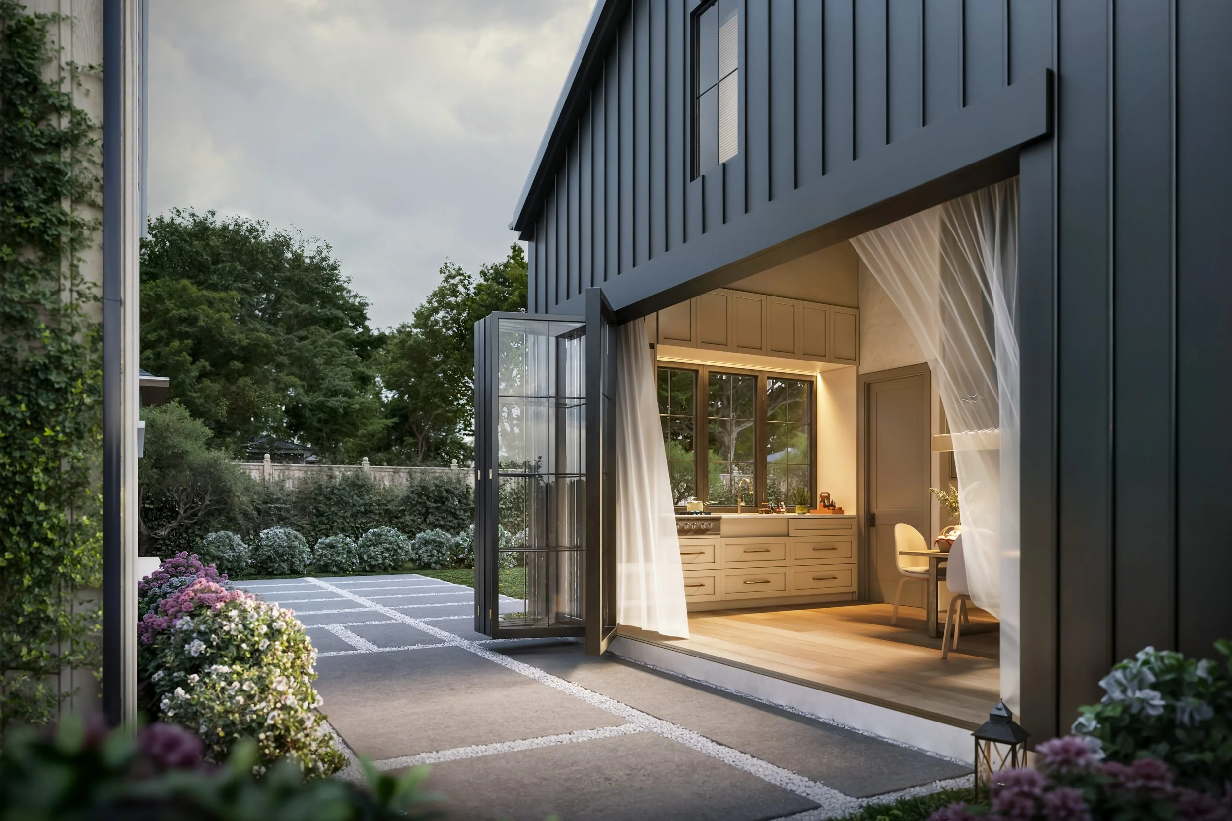Exterior: crisp white façade, black windows, taupe/grey front door, standing-seam metal roof