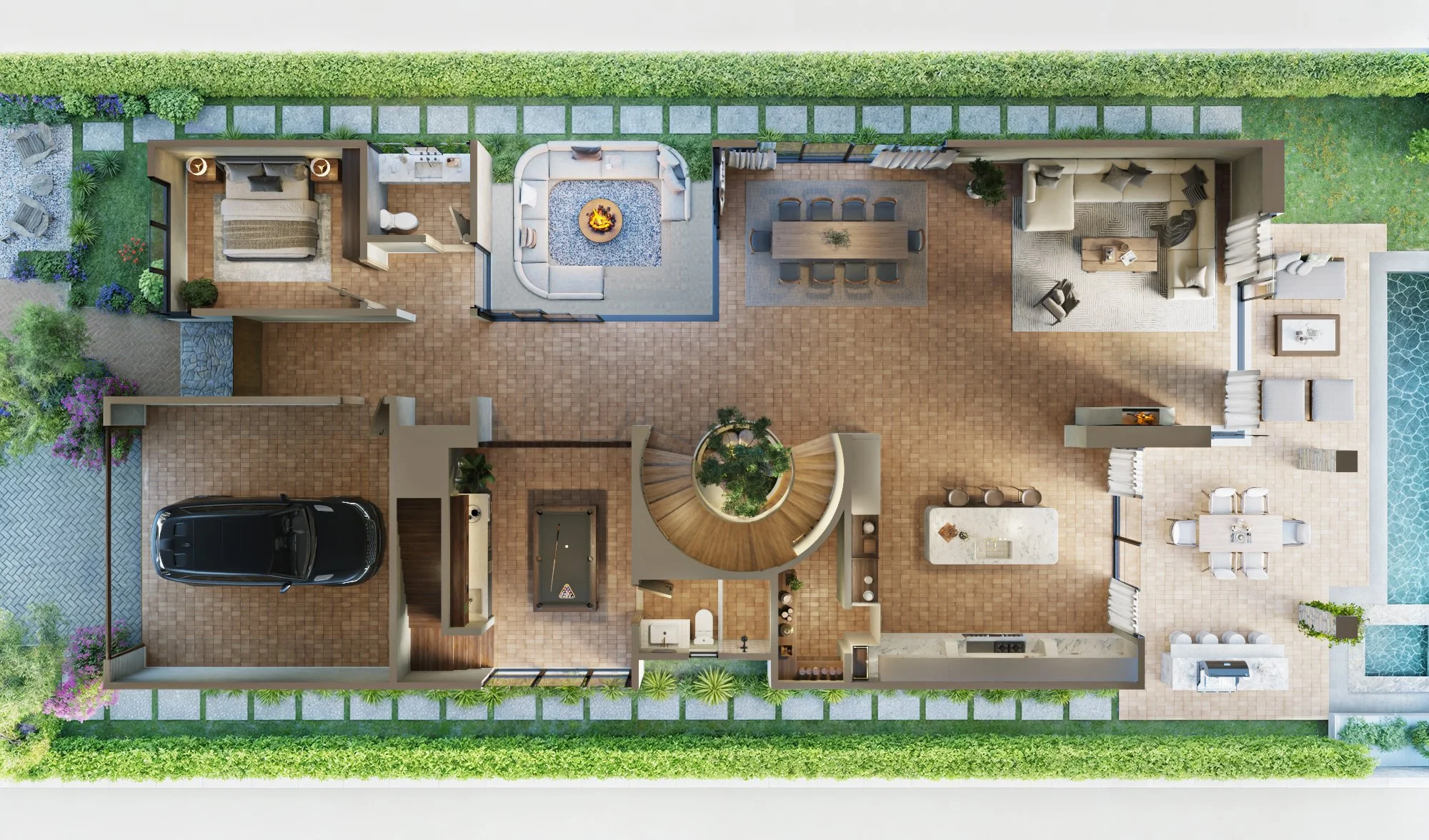 Pool/Spa, Sunken Garden, & Curved Staircase